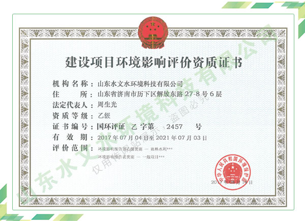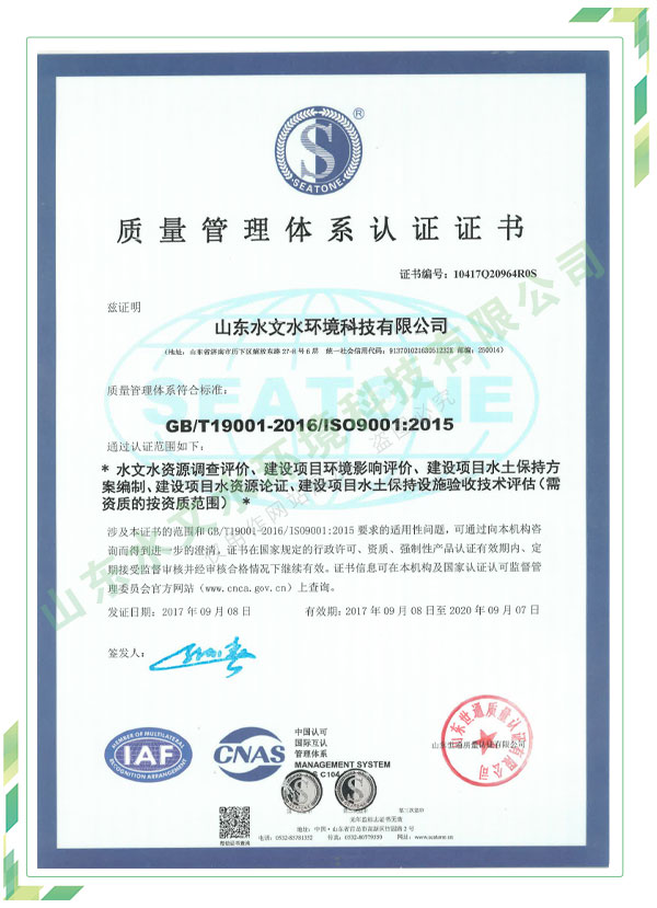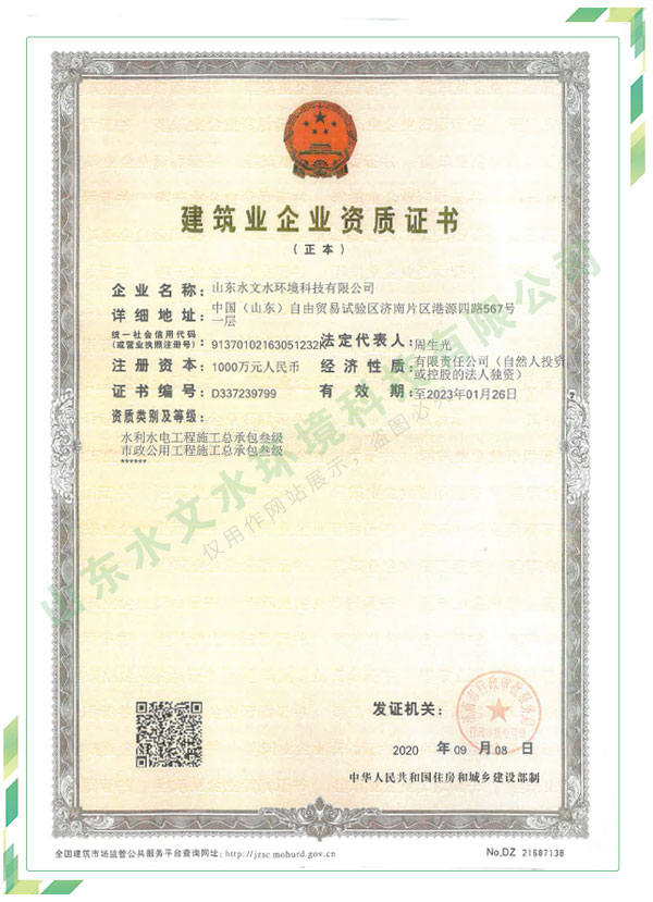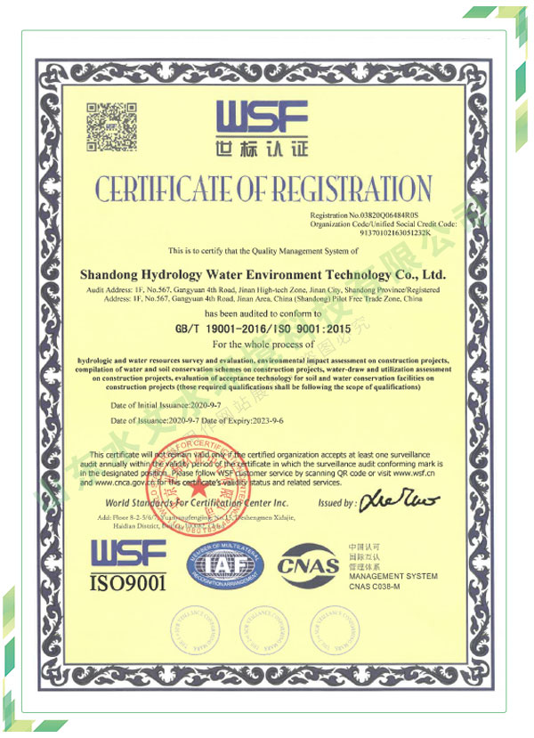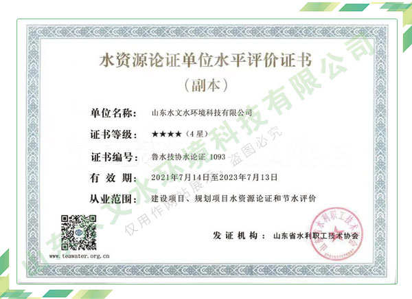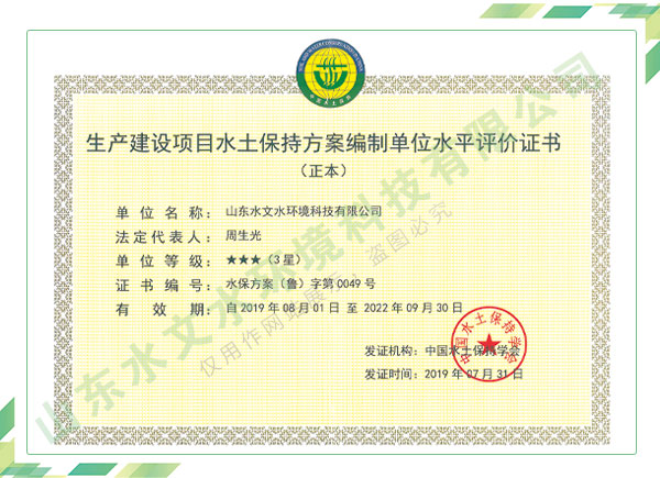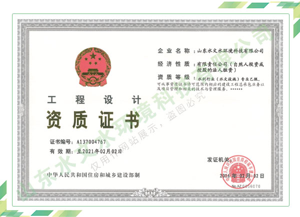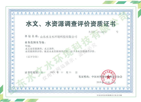 公司擁有水利工程設(shè)計、水土保持、水文水資源調(diào)查評價、水資源論證、建設(shè)項目環(huán)境影響評價、市政公用工程施工總承包、水利水電工程施工總承包、電子與智能化工程專業(yè)承包等資質(zhì),2017年通過質(zhì)量管理體系、環(huán)境管理體系、職業(yè)健康安全管理體系認證;2020年被評為國家級高新技術(shù)企業(yè),同年被中國水利企業(yè)協(xié)會推薦為第一批“合同節(jié)水服務企業(yè)”;2021年被山東省、濟南市評為 “專精特新”中小企業(yè)。業(yè)務范圍涉及水利工程設(shè)計;節(jié)水設(shè)計、改造、水平衡測試;山洪災害調(diào)查;城市水資源調(diào)查評價;建設(shè)項目水土保持方案編制、監(jiān)測、驗收、水土保持規(guī)劃;水安全保障規(guī)劃、建設(shè)項目水資源論證、規(guī)劃水資源論證;建設(shè)項目環(huán)境影響評價;入河排污口論證;防洪影響評價;市政公用工程施工、水利水電工程施工、電子與智能化工程施工等。